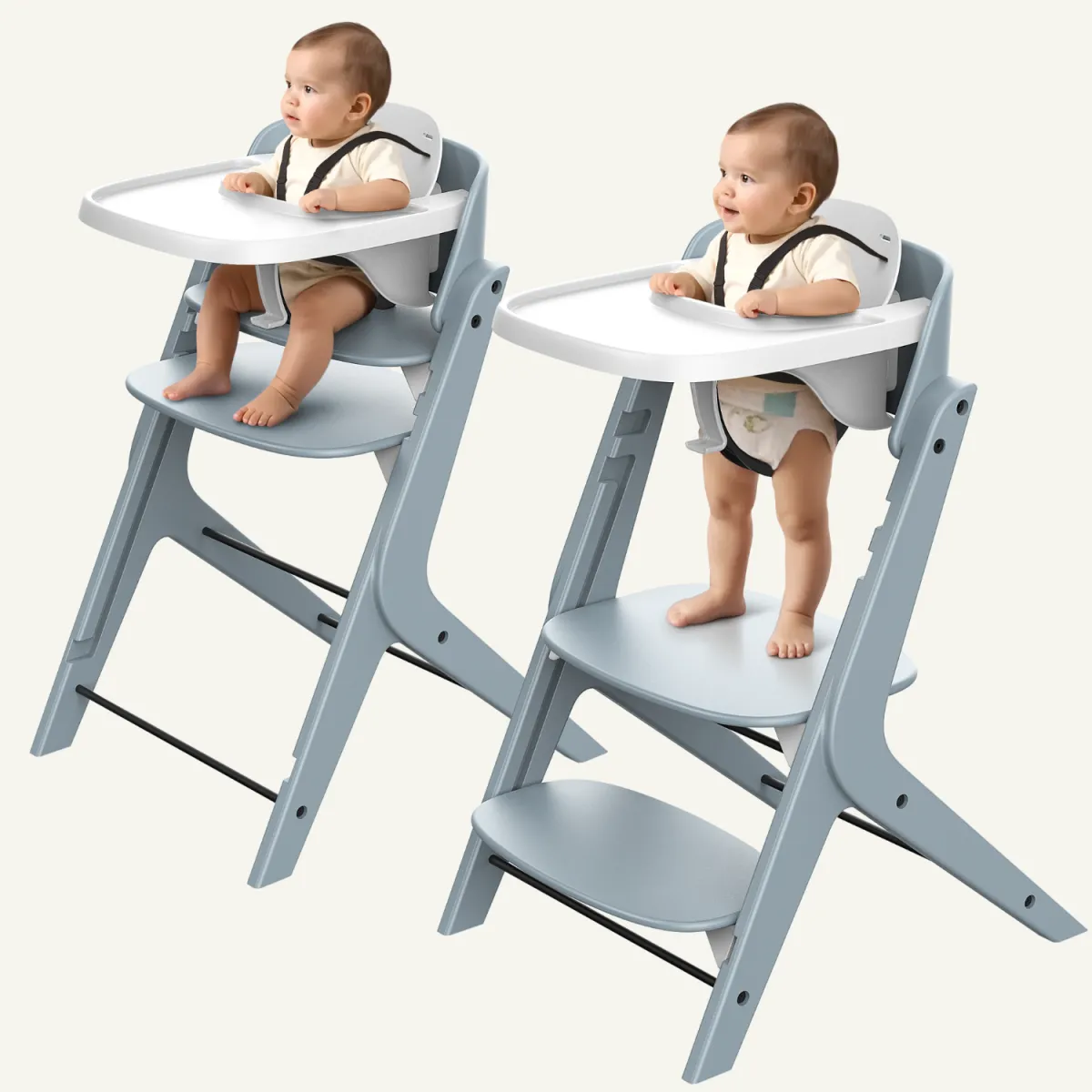 The VezaFlex™ is designed to adapt to your child’s needs—supporting them in the moment and as they grow. The sitting mode can be used starting at about 4–6 months, after your child shows signs of developmental readiness, such as independent head control, the ability to sit upright with support and sufficient core strength for safe feeding posture. The standing mode becomes appropriate generally around 9 or 10 months, after your child hits key milestones that demonstrate their ability to stand safely.